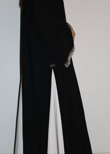Exquisite hand-embellished crystal detailing cascades along the split of the sleeves, shimmering with every movement — a subtle nod to luxury. The contrasting ivory inner panels create a striking visual balance, adding depth, dimension and an ethereal look to the timeless black canvas whilst.